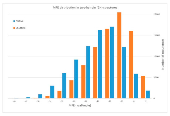 The MFE distribution of all two-hairpin (2H) structures in our dataset comparing native and shuffled sequences. Reported p-value (see text) is less than 0.0001.