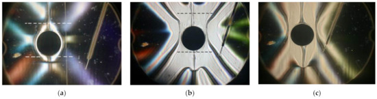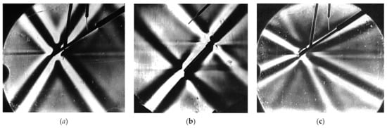 In a wave field generated by a vertically oscillating sphere, which is a more effective source of internal waves than a band even at small amplitudes of displacements, the schlieren images present periodic internal wave beams together with short vertical and horizontal strips (ligaments) and high-gradient envelopes of the near region (Figure 3a). As the sphere motion amplitude increases, wave beams are bounded by envelopes (dark strips at the boundaries of internal wave beams in Figure 3b). In the case of the large amplitude of the sphere displacements, internal wave beams originate at a thin interface that is bounded to the near zone, including a blocked liquid (Figure 3c), and outlined by a system of ligaments represented by dark strips at the edges of the wave beams.