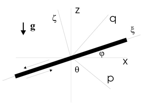 Here is the density perturbation; is the velocity; is the pressure, minus the hydrostatic pressure; is the acceleration of gravity; and is the unit vector in the upward direction of the vertical axis. The calculations are performed in a laboratory (the gravity acceleration is opposite to the z-axis) and the sloping plate coordinate frames, which are shown in Figure 1, as well.