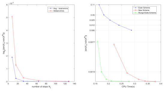 (Left) The global error and Avg.local error of Scheme 1 for Example 1. (Right) The correlations for global errors and CPU Time of all schemes.