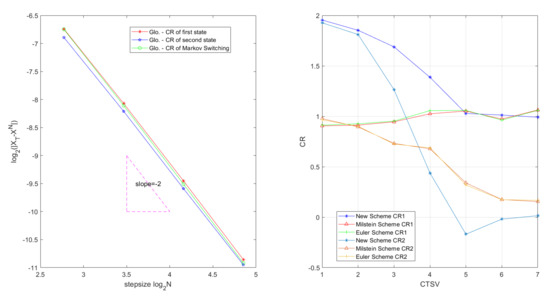 In Table 3, we find that Example 2 can also obtain that Glo.CR and Avg.local CR have the order 2.0 and order 3.0 of the new scheme. In Figure 4 (left), we clearly show that the global errors are different between a single state and switching states. In Table 4, for all three schemes, we fix a rational upper bounds of state values and find that the convergence rate of the new scheme will tend to order 1.0 when all state values become bigger. Meanwhile, the convergence rates of Milstein scheme and Euler scheme stay stable at order 1.0. In Table 5, for all three schemes, we fix the state difference and find that the convergence rate of the new scheme decline rapidly when all state values become bigger. The convergence rate of the new scheme is even negative when the state values are extremely big. Meanwhile, the convergence rates of Milstein scheme and Euler scheme are very low when the state values are extremely big. For more intuitive display, Figure 4 (right) shows the change process of convergence rate with the change times of state values (CTSV).