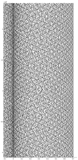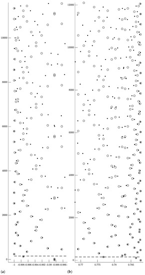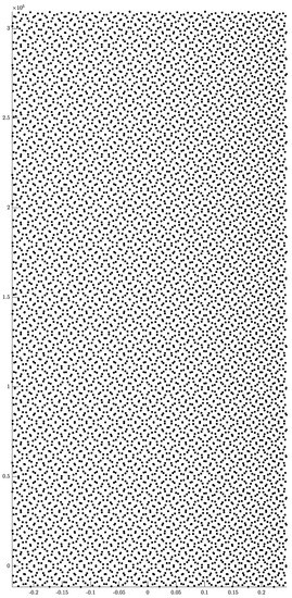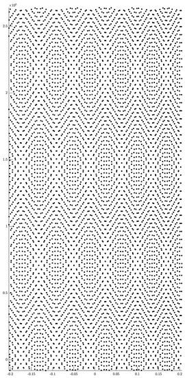 By scaling the multiplicities , , by a factor of , we obtain the nongeneric nonlattice Dirichlet polynomial , with LSA constant , calculated by using the formula (23) in Theorem 3. As a result, we obtain a more tractable version of the 2-3-4-6 polynomial. Table 4 shows data for several lattice string approximations to , and just like for the 2-3 polynomial in Example 1, we generate lattice string approximations by approximating . We note, however, that they are not as good as the ones from Table 2 because the LSA constant is smaller. Figure 5 displays the roots of moving away from the roots of . We again observe that the roots remain close to the roots of near the two extreme vertical lines and , as shown in parts (a) and (c) of Figure 5, respectively. However, we see in part (b) of Figure 5 some of the roots staying close to a third line, . Figure 6 shows one period of stable roots of the lattice string approximation , giving an impression of two distinct quasiperiodic patterns on each side of the vertical line . Note that while the part to the left is smaller than the part on the right, both parts consist of roughly the same number of roots, which may be inferred by observing that the roots in the left part seem to be more densely distributed than the ones in the right part.
