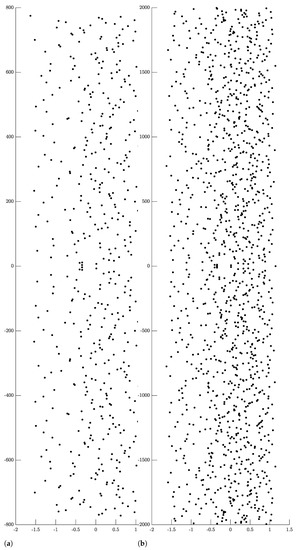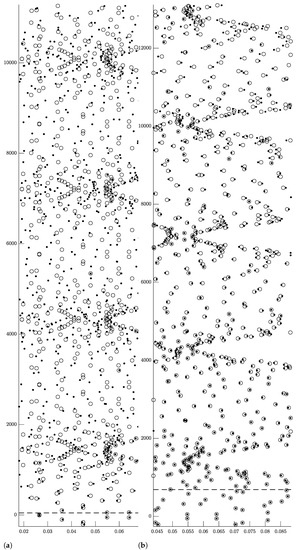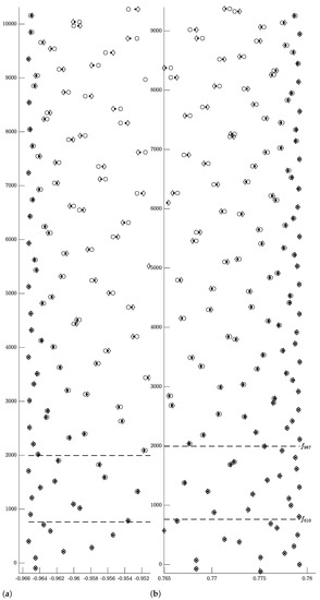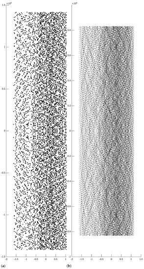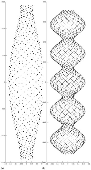 In the lattice case, the complex dimensions (see Section 2 for a reminder of the definition of the complex dimensions as the poles of the ‘geometric zeta function’ associated with a fractal string.) can be numerically obtained via the roots of certain polynomials that are typically sparse with large degrees, and lie periodically on finitely many vertical lines counted according to multiplicity. Furthermore, on each vertical line, they are separated by a positive real number , called the oscillatory period of the string. (See [5] (Chapter 2), ref. [6] (Theorem 2.5), and [8] (Theorems 2.16 and 3.6)).
