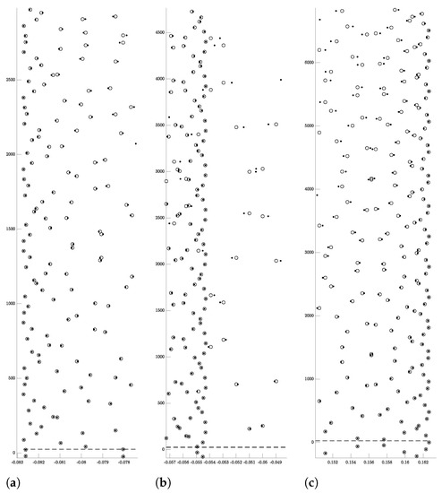 Roots of f(s) from Example 3 near the vertical line (a) , (b) , (c) (marked with dots), moving away from the roots of f306(s) (marked with circles).