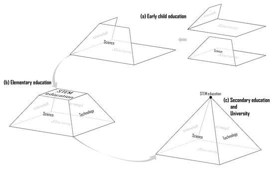 From our point of view, in early childhood education it would be more recommendable to choose simple problem situations that make it possible to show students the effect of the STEM disciplines on society (Figure 1a), in a way that the understanding (identification and application) of their social repercussions is the preamble to the implementation of a STEM approach in the educational stages following it. Thus, in order to gradually implement STEM education it would be recommendable to opt for a nested or multidisciplinary degree of integration (Table 1, level 1) in primary education (Figure 1b). Both modes of disciplinary integration are characterized by making the existing connections among the disciplines involved in the task explicit [], in a way that the development of STEM literacy in students would begin. In this initial stage the teacher is fundamental, as he or she will be responsible for making the connections between the STEM disciplines visible and, in parallel, the possible repercussions they may have on society. In secondary and university education the teacher could adopt a more secondary role, given that students would have certain experience in this educational approach, and the acquisition of STEM literacy would have already started. Therefore, in these educational stages (Figure 1c), it could be possible to opt for a degree of interdisciplinary or transdisciplinary integration (Table 1, levels 2 and 3), which leave the identification of the existing links between the STEM disciplines in the hands of students, along with the integrated application of their knowledge to solve the problematic situations set.