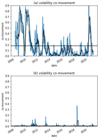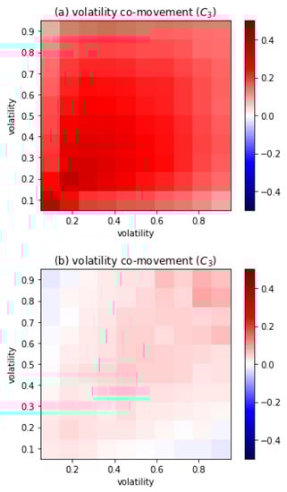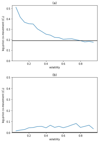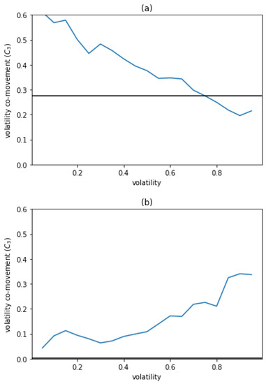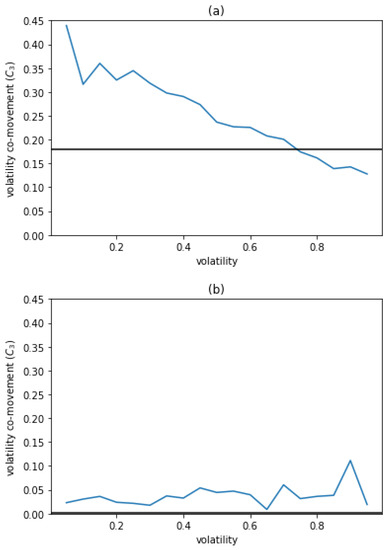 In Scheme 2a, the volatility co-movement decreases with the volatility, that is, the stocks with smaller volatility reflect a greater co-movement, and as the value in volatility increases the co-movement is lower. In particular, the co-movement of stocks with low volatility is significantly higher than the average value (considering all stocks and the whole period), marked by the horizontal black line at . This graph shows that volatility is indeed a relevant factor to consider when studying volatility co-movement.