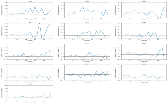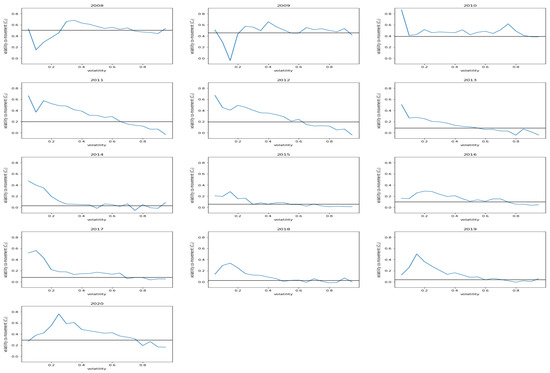 We focus now on changes of the distribution of the co-movement as a function of the volatility in time. For this purpose, is calculated as the average of in natural years, and we present the distributions in Scheme 4 for all years, together with the average within this year for all stock pairs (horizontal black lines). As discussed above, periods of crisis can be identified by the high value of the average co-movement (in 2008–2010 it reached 0.4, and in 2020 it was above 0.3), whereas stable years yield a smaller value, close to zero. Even more, the distribution of co-movement also changes notably from crisis to stable periods, being generally higher and flatter in the former, and lower and decreasing in the latter.