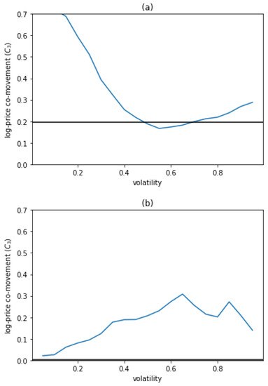 Log-price monthly co-movement () as a function of volatility during the period 2008–2020; (a) the market is not subtracted; (b) the market is subtracted.