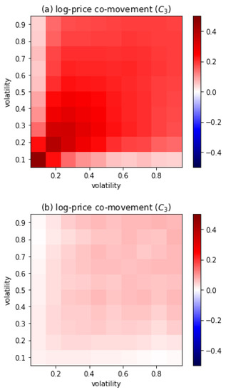 Log-price yearly co-movement () as a function of volatility during the period 2008–2020; (a) the market is not subtracted; (b) the market is subtracted.