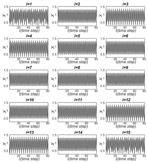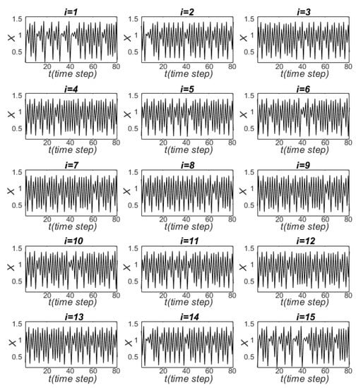 As it is seen from Figure 3 and Figure 4, the perturbation  results in a violation of the initial identity of the oscillators. It is also seen that the oscillations for  are identical to those for , the oscillations for  are identical to those for , etc. This symmetry results from the choice of the perturbed oscillator location and the periodic boundary conditions. All the time series in Figure 3 and Figure 4 are chaotic (just as they were for , see Figure 2); the corresponding numerical values of the dominant Lyapunov exponent  of the oscillations, which are shown in Figure 3 and Figure 4, range from +0.07 to +0.45 (the logistic map) and from +0.10 to +0.40 (the Gompertz map).