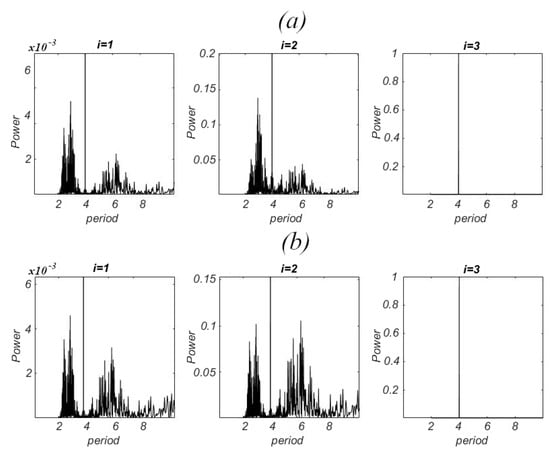 Figure 8 demonstrates the power spectra of the logistic time series for , and 4, and the corresponding power spectra resulting from the exchange processes (). Oscillations for  are chaotic, while regular behavior takes place for  (Figure 5).