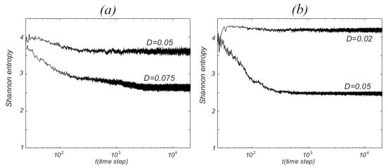 One can see that if the dynamics of all the oscillators in the ring remains chaotic over time (as for  for the Gompertz map and for  for the logistic map), then  depends on time only weakly. A much more noticeable drop in the entropy (Figure 10;  for the Gompertz map and for  for the logistic map) occurs if, over time, the chaotic dynamics of most of the oscillators is transformed into regular dynamics (Figure 5 and Figure 6; see also the power spectra in Figure 8 and Figure 9). Thus, a shift in the value of the Shannon entropy over time may reflect the occurrence of qualitative changes in the dynamics of the system of coupled oscillators as a whole.