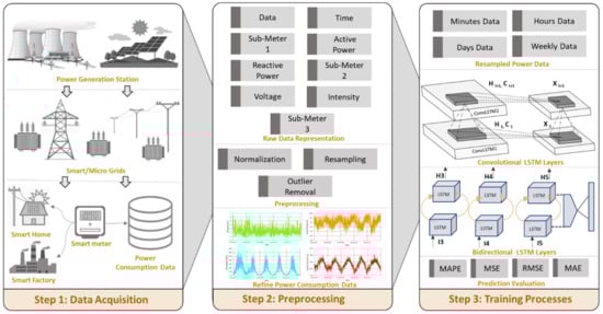 Precise forecasting of energy consumption in commercial and residential buildings assists smart grids to efficiently manage the demand of occupants and conserve energy for the future. Several traditional sequential learning forecasting models have been developed for energy consumption forecasting that reveal inadequate performance due to the utilization of unclean data. These approaches face various problems while learning parameters from scratch, such as overfitting, and short-term memory difficulties, such as data increases or the association between variables, become more complex []. These problems can be easily tackled through sequential learning models that have the ability to capture spatial and temporal patterns from smart meters data at once. Based on this assumption, we developed a novel forecasting framework that provides a useful way to overcome the energy forecasting problem. The overall dataflow of the proposed framework is divided into three steps, as shown in Figure 1. First, the total consumed energy data are obtained from smart meters/sensors that contain abnormalities due to external influence. Next, data cleansing techniques are applied to the collected data in preprocessing step for eliminating the abnormalities. In the final step, the preprocessed data are fed into the one-dimensional ConvLSTM for features encoding, followed by the BiLSTM network that efficiently decodes the feature maps and learns the sequence patterns. The proposed framework is evaluated on various resolutions of data, i.e., minutely, hourly, daily, and weekly for short- and long-term forecasting using common error evaluation metrics. A detailed description of each step of the proposed framework is provided in the following subsections.