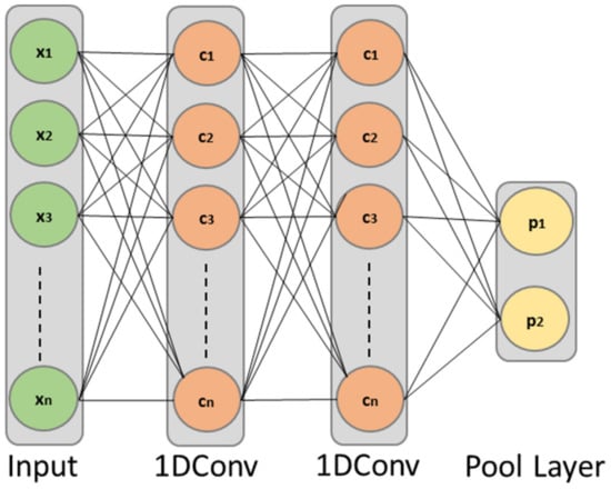 In computer vision, 2D CNN models have shown an encouraging performance on both image and video data such as facial expression analysis [], action recognition [], movie/video summarization [], violence detection [], etc. The 2D model accepts input in the two-dimension format in which pixels of images with color channels are processed simultaneously known as feature learning []. The same process can be applied in 1D sequential data but with variations in the input. Therefore, 1D CNNs are considered as an efficient approach for time series data to extract fixed-length feature vectors. In the case of non-linear tasks such as energy consumption prediction/forecasting, CNN utilizes the weight sharing concept that provides minimum error rate in terms of MSE []. In this study, we use two 1D CNN and pooling layers for efficient encoding the sequences of energy data, as shown in Figure 4, where x1, x2, x3, … xn represent the input data, c1, c2, c3, … cn, indicate the 1D convolutional layers for generating feature maps, and p1, p2 illustrate pooling layers that are employed to reduce the feature maps dimensions.