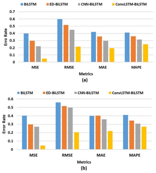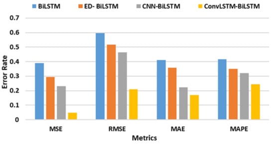 Finally, we performed experiments for long-term prediction by keeping the weekly resolution, as shown in Table 6. The best prediction model on the weekly dataset is also ConvLSTM–BiLSTM that obtains the least error rate for both datasets. For instance, for the Household Dataset, ConvLSTM–BiLSTM obtained 0.028, 0.167, 0.155, and 20.15 for MSE, RMSE, MAE and MAPE, respectively, and 0.025, 0.158, 0.143, and 20.91 for the Commercial Dataset. In contrast, the second-least error is obtained by CNN–BiLSTM. To summarize all the results in one graph, we calculated the average of each resolution (i.e., minutely, hourly, daily, and weekly), as illustrated in Figure 5. The MAPE value is ranged between zero and one instead of percentage for better representation. It is clear from Figure 5 that ConvLSTM–BiLSTM is leading in each dataset and metrics in terms of least error rate, followed by CNN–BiLSTM, ED–BiLSTM, and BiLSTM as runner up, third, and fourth place, respectively.