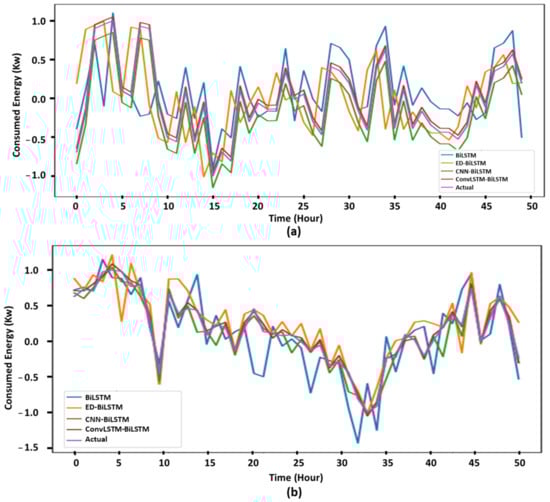 This section presents a comparative analysis of the proposed prediction model with seven recent state-of-the-art hybrid models based on hourly sampled data of the Household Dataset, as shown in Table 9. All the methods in comparison extract features using simple CNN and then forward the extracted features to different sequential learning models for energy consumption predictions. For instance, LSTM [], auto encoder (AE) [], Multi-layer Bidirectional LSTM [], Bidirectional LSTM [], LSTM followed by AE [], GRU [], and CNN with multilayer bidirectional gated recurrent unit (CNN–MB–GRU) []. For this comparison, we select the best-proposed model from Section 4.3, i.e., ConvLSTM–BiLSTM, which uses ConvLSTM as an encoder and bidirectional LSTM as a decoder. The proposed model outperforms state-of-the-art models in MSE and RMSE with the least error rate of 0.10 and 0.32, respectively. The proposed model reduced the error rate up to 0.08 and 0.1 points compared to the runner-up model CNN–MB–GRU [] with MSE and RMSE values of 0.18 and 0.42, respectively. However, the least error rate for MAE is achieved by CNN–MB–GRU [] with 0.29, while the proposed and CNN–LSTM–AE models remain runner up with a difference of 0.02. The proposed model achieved 30.05 error rate for MAPE metrics and remains runner up with a very little difference. The least error rate is achieved by CNN–MultiLayer–BiLSTM [] with 29.10 and the difference with proposed model is only 0.95. Hence, the overall results demonstrate the superiority of the proposed model over state-of-the-art based on Household Dataset. Lastly, Figure 7 illustrates the prediction results of the proposed sequential learning models on hourly resolution data for both datasets.