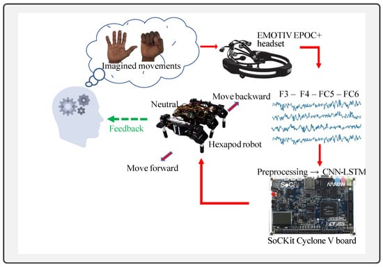 In this study, robot perception and control were conceived to operate in real time. Simultaneously, data were stored on the SoCKit. The zoomorphic robot used has two degrees of freedom in each leg. In total, twelve servomotors quickly achieve static and kinematic stability. Figure 1 shows the proposed method’s flowchart using an Emotiv EPOC+ for capturing EEG signals and a CNN-LSTM architecture implemented on the SoCKit to control a robot.