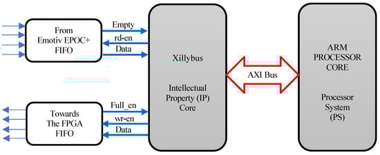 Communications were established between the processor and the FPGA core by configuring the Xillybus Intellectual Properties (IPs) Core, as showed in Figure 3.