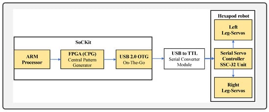Quartus II Version 13.0 was used to embed the project descriptive architectures, to ensure the processing and classification of motor imagining EEG signals. Real-time signal processing starts when the Emotiv EPOC+ system sends EEG signals at 128 samples per second to the SoCKit card. Next, the NIos-II IDE cache memory was previously preloaded with the designed neural network parameters. Therefore, the SoCKit can instantly convert classified EEG signal features into commands to move the hexapod. Moreover, the SoCKit USB 2.0 On-The-Go (OTG) port was used to connect the Serial Servo Controller SSC-32 Control board through the USB to TTL serial converter module.