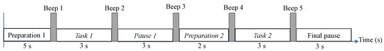 Time sequence of each trial. The total trial duration was established at 19 s, where 6 s were used for the related MI tasks: the left fist as Task 1 (3 s) and the right fist as Task 2 (3 s). The neutral or reference action was taken as the final pause (3 s) to have an equal number of samples per class.