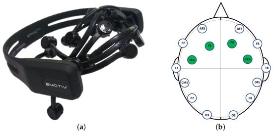 Signals from the F3, F4, FC5, and FC6 sensors were processed in the MI recognition process [31,32]. Such sensors were located in the rear portion of the frontal lobe, as shown in Figure 7.