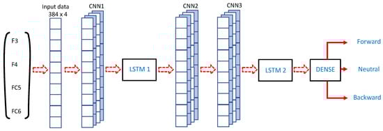 Recurrent neural networks (e.g., LSTM networks) are composed of memory units that temporarily store information [39]. Such a network’s layer structure is not unique because the interconnections between neurons are not based on a transportable (mutable) logic. The feature extraction and classification of EEG signals are done by combining two neural schemes, the CNN and LSTM. Figure 8 presents the CNN-LSTM architecture integrated into the SoCKit to decode robot commands. The overall network consists of a sequence of layers: a convolutional layer (CNN1), an LSTM layer (LSTM1), a convolutional layer (CNN2), followed by a max-pooling layer, a convolutional layer (CNN3), an LSTM layer (LSTM2), and a dense layer.