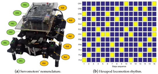 (a) The SoCKit-hexapod embedded system. The hexapod operates with twelve degrees of freedom using the Coxa (C) and Femur (F) articulations on the Right (R) and Left (L) sides. (b) Hexapod locomotion patterns. At any locomotion step, the corresponding servomotor activation is painted in yellow and deactivated in blue.