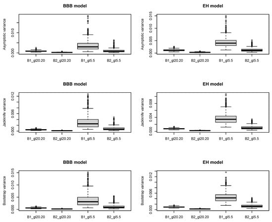 Boxplot for AV, JK and BS variances of and in SRSS in the BBB and EH models.
