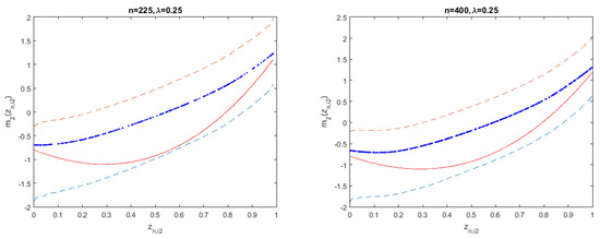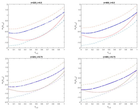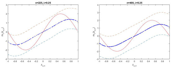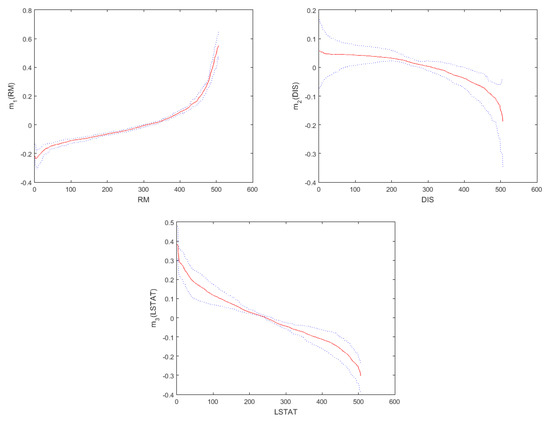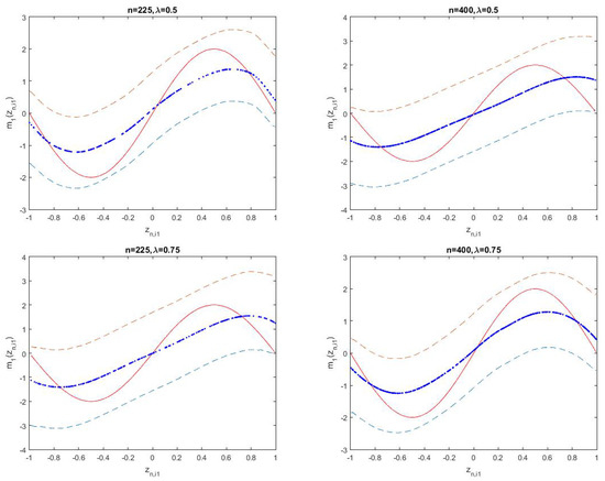 Figure 1 shows the fitted results and 95% confidence intervals of unknown function for three cases of when and , respectively. The short dashed and solid curves display the true unknown function and its estimates, respectively. The long dashed curves describe the corresponding 95% confidence intervals. Figure 2 shows the corresponding fitted results of unknown function . By observing the fitting effect and confidence intervals of unknown functions in Figure 1 and Figure 2, we find that the small sample performances of nonparametric functions are good.