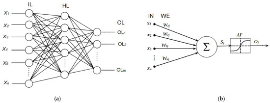 Schemes for the structure description of the artificial neural networks (ANNs): (a) Description of neural network architecture: IL —input layer, HL—hidden layer, and OL—output layer; (b) Description of neural network active node: IN—inputs, WE—weights, AF—activation function, Sj—sum of the weighted input, and Oj—output activation function.