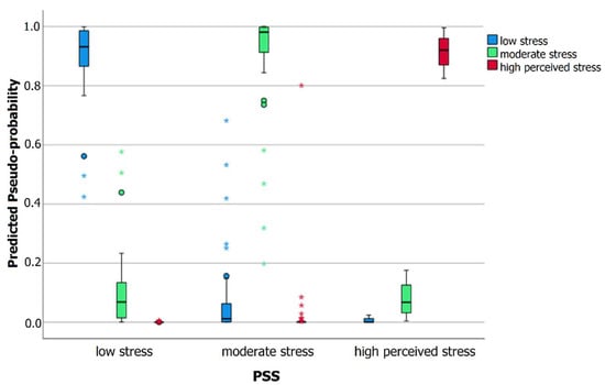 Additionally, the conducted analysis results from the IBM SPSS 27v software presented the ANN2 model’s predicted pseudo-probability for the three perceived stress categories of the PSS variable in a box-plot diagram. This specific graph separately illustrated the predictions for the three categories of the dependent variable PSS. Moreover, it should be pointed out that this diagram shows box plots that categorize the predicted pseudo-probabilities based on the whole analyzed dataset. According to the rule, for each box plot in each different category, the values above 0.5 can confirm the correct predictions.
