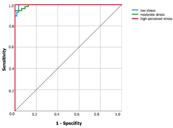 With further processing, the ANN2 model was validated by the ROC curve, which showed the classification performance for all possible cutoffs by a diagram of sensitivity versus specificity. The measures of sensitivity and specificity for the designed ANN1, ANN2, and ANN3 models were presented as an area under the curve (AUC), which presents the entire position of the ROC curve according to the PSS variable’s three stress categories: low stress, moderate stress, and high perceived stress (see Table 7).