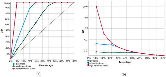 In the holdout sample, the low stress rate (or low stress, moderate stress, or high perceived stress rate), assumed by the equation , was found to be 75.0%, the predicted moderate stress rate was 76.5%, and the high perceived stress rate, , was 50.0% with 72.0% accuracy of the model.
