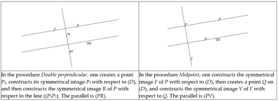 This requires the design of appropriate situations. The authors describe one example in great detail. In it, students are asked to construct a line parallel to a given line (D) and passing through a point P outside it. In such a situation, the choice of the command allowed is an important didactic variable. Here, the command menus have been drastically reduced (an essential possibility offered by this software). In the “Construction” menu, for instance, the commands “Point on object”, “Intersection of two objects”, “Symmetric point with respect to a line or to a point”, and “Angle bisector”, only, are accessible. In addition, the line (D) has been created with the “Basic line” command of the “Creation” menu, which makes it possible to create a line passing through a single point. Their motivation is to prevent a blind iteration of the symmetry commands from two points on the line making appear by chance a point perceptually located on the parallel asked for. In their a priori analysis of this situation, the authors explain how these choices were made to create an antagonist adidactic milieu, in the sense of TDS, and what effects they anticipate from these choices. Then, analyzing in detail the students’ procedures in two grade 8 classes, which the Session Journal command makes possible, they confirm the potentialities identified in the a priori analysis. The students begin with constructions using drawing commands; for example, they create a basic line passing through P and perceptually adjust its orientation to make it parallel to (D). These first constructions do not resist dragging; however, thanks to their interaction with the software and their interpretation of perceptual feedback, all students eventually produce, without external help, correct geometrical constructions. The two constructions presented in Figure 1 are the dominant ones. The authors also identify unexpected procedures combining drawing and construction commands, for example, when students create a basic line and turn it to make it perceptually perpendicular to (D), then construct the symmetry of P with respect to this line, to determine the parallel looked for. The authors also observe that geometry can emerge as a means of reproducing or explaining visual effects, in the face of unexpected visual phenomena produced by their actions, for example, by a combinatorial game with commands of the menu. According to the authors, this opens up a new way, in which “learning geometry in its early stages would consist of learning to control the relationships between the visual and the geometric” (ibid., p. 205, our translation), playing on the dialectic between the visual and the geometric instead of opposing them.