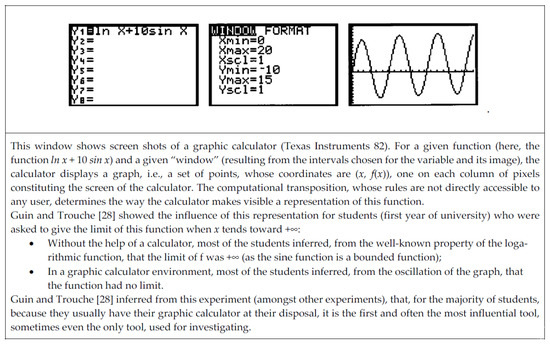 Calculators were often introduced in classrooms by the students themselves. Students’ habit of using calculators (their own property), often without the teacher’s monitoring, led to new didactical phenomena (Figure 2), going against optimistic assumptions of tools that would naturally support learning and evidencing the complexity of mathematics learning in complex technological environments. The provision of powerful tools such as CAS, integrating functionalities of graphical representation and of both numerical and formal computation, does not necessarily facilitate conceptualization. Analyzing these phenomena required specific experimental research that was supported by the French Ministry of Education. Several IREMs and laboratories of research mobilized to study the process of integration of CAS and of symbolic calculators in ordinary high-school classrooms [27]. This research drew attention to the influence of images on conceptualization [28] and to a range of phenomena well described by Artigue [2]. She combined, for her analysis, the ATD (for thinking about the social and institutional conditions of technological integration), the TDS (for thinking about the design of situations taking advantage of tools), and the computational transposition, introduced by Balacheff [29], for modeling the distance between a mathematical entity and the way it is represented by a tool. This research indicated the need for rethinking the link between the technical and the conceptual dimensions of tasks.