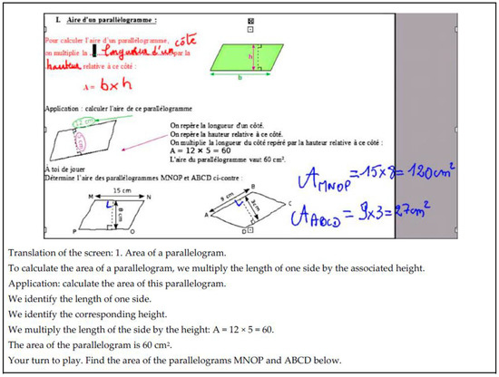 Traces, on an interactive whiteboard, of a teacher’s work introducing the computation of the area of a parallelogram ([68], p. 208).