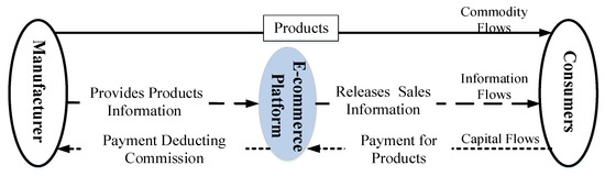 The rapid innovation of network technologies has enabled e-commerce to expand with convenience and fast responsiveness. Enterprises cooperate with third-party e-commerce platforms, such as Jingdong and Amazon, forming the e-commerce supply chain (eSC) [1]. Manufacturers usually play a decisive role and coordinate the interests of all members to ensure more efficient operations in traditional supply chains [2,3]. However, in eSC, e-commerce platforms—as rule-makers of the operation and leaders of the system—often control commodity flows, information flows, and capital flows, and occupy a favorable position. Moreover, because of the high cost of establishing and maintaining a platform, a dominance of e-commerce platforms has gradually formed.
