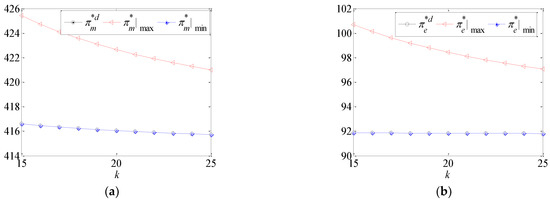 (i) The manufacturer’s profit and the platform’s profit after the implementation of the coordination contract when are presented in Figure 2, where and denote the manufacturer’s profit and the platform’s profit after coordination, respectively. According to , should satisfy so is feasible. The feasible range of is and the feasible range of is . It can be observed that the coordination contract can improve both parties’ profits compared with the decentralized model. The increase in the platform’s profit is significantly higher than that in the manufacturer’s profit, further validating the feasibility of the coordination contract under the assumption that the platform is a leader. Moreover, increased profits indicate that the altruistic preference joint commission rate contract can realize Pareto improvement and achieve coordination.