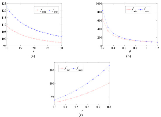 (iii) Let and , the impact of on the feasible range of () is illustrated in Figure 3b. According to , should satisfy so is feasible. It is shown that is negatively related with, and as increases, the declining rate gradually slows down. Moreover, the upper limit of decreases faster than the lower limit, and makes the coordination space smaller.