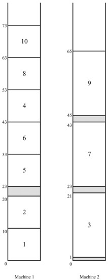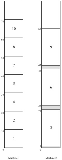 The application of an emerging job has two “opposite” effects. On the positive side, since the number of jobs scheduled before the kernel in the schedule is one less than that in the schedule S, the overflow job in the schedule will be completed earlier than it was completed in the schedule S; likewise, the completion time of that job, which is scheduled as the latest one of the kernel in the schedule , will be smaller than the completion time of the job in the schedule S. Hence, the application of an emerging job gives a potential to improve schedule S. On the negative side, it creates a new gap within the former execution interval of job e or at a later time moment before kernel (see Lemma 1 in [2] for a proof for the case of identical machines, the uniform machine case can be proved similarly). Such a gap may enforce a right-shift (delay) of the jobs included after job e in the schedule ; (for example, a new gap “[20–23]” that arises for machine 1 in the C-schedule in Figure 2 enforces a right-shift of jobs 8 and 10 included behind job 4). Thus, roughly, the C-schedule favors the kernel but creates a potential conflict for later scheduled jobs (jobs 8 and 10 in the above example).