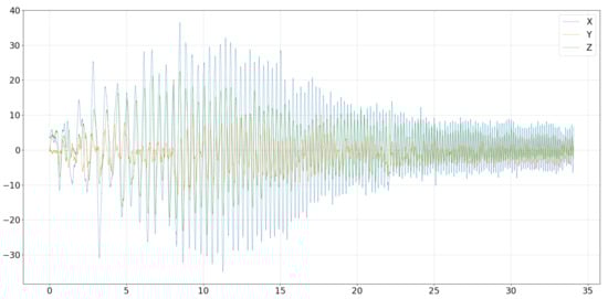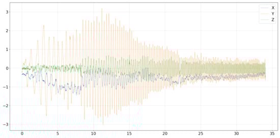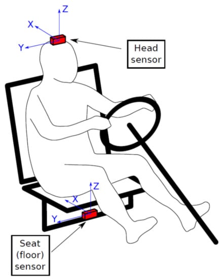 The excitation signal is an angular acceleration imposed on the seat of the user. This acceleration is an oscillating chirp function with a frequency range of 1 to 7.5 Hz on the X axis in rotation. The linear acceleration and angular velocity were measured in both the head and the seat by two IMU (Shimmer inertia measurement unit (IMU) sensors) at 256 Hz. By observing the floor excitation signals, we noted that the excitation is purely rotational around the X-axis—see Figure 2.