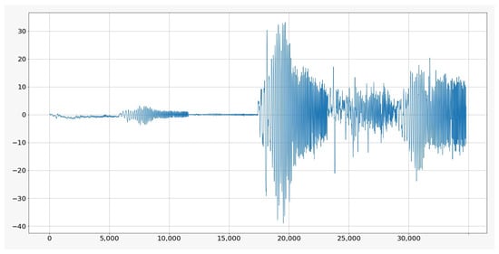 The six time series of each observation were collapsed into a single concatenated time series with a size of 34,800—see Figure 5. The concatenated time series for the 216 observations were then stacked to create the dataset D with a size of 34,800. We also used binary labels in the chained time series on the two target classes that we were interested in. In particular, we wrote where is "0" for a relaxed driver and “1” for a tense one.