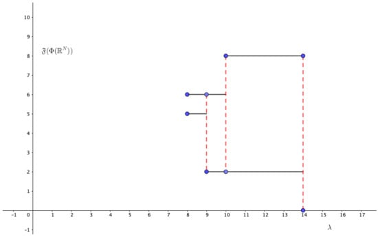 This allows us to construct the map as shown in Figure 6. Then, and , and we have the following symbolic λ sub-level sets.