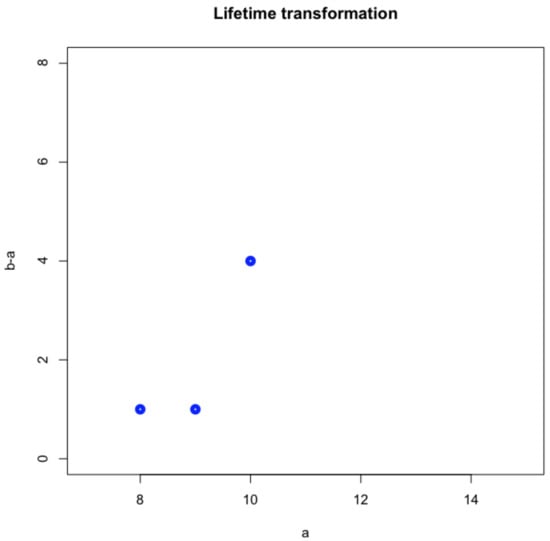 (see Figure 8). An equivalent representation of the persistence diagram is the life-time diagram for , which is constructed by means of a bijective transformation , acting over , that is,