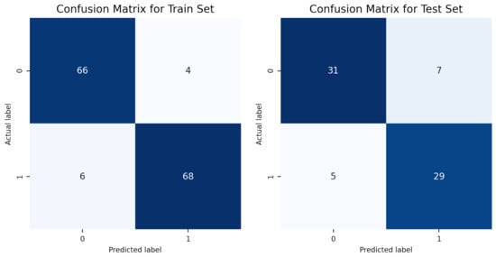 The trained random forest classifier model for the persistence images has a notably high accuracy score on the training dataset (144) for both approaches and high accuracy for the testing dataset (72 samples). This suggests strong differentiation of the images with the respect to their generating signals, see Figure 10. The scores on the training and testing are 93 and 83%, respectively. The leave-one-out cross-validation achieved a score of 81%, indicating a good variance–bias trade-off and good generalization potential of the model.