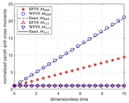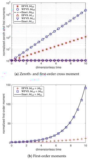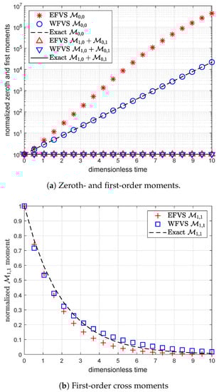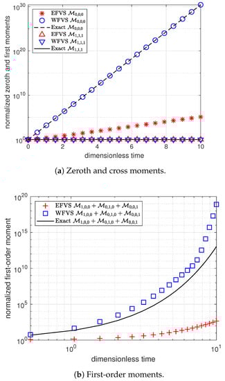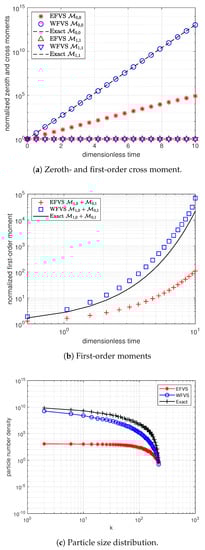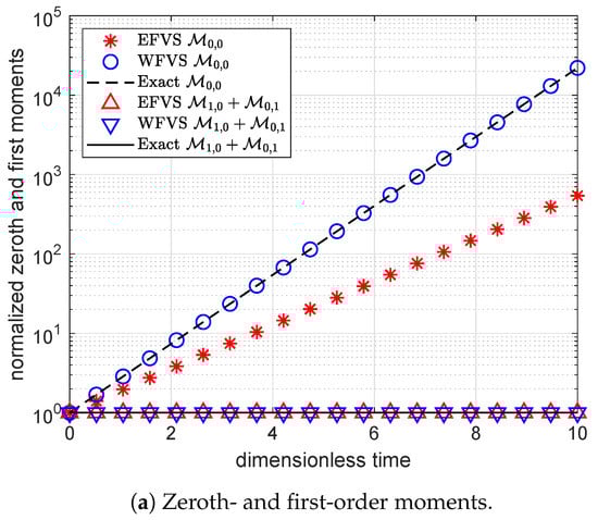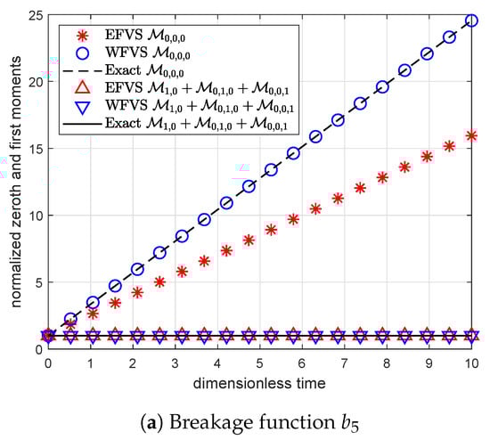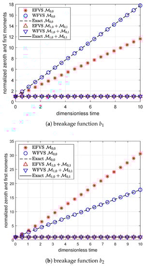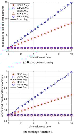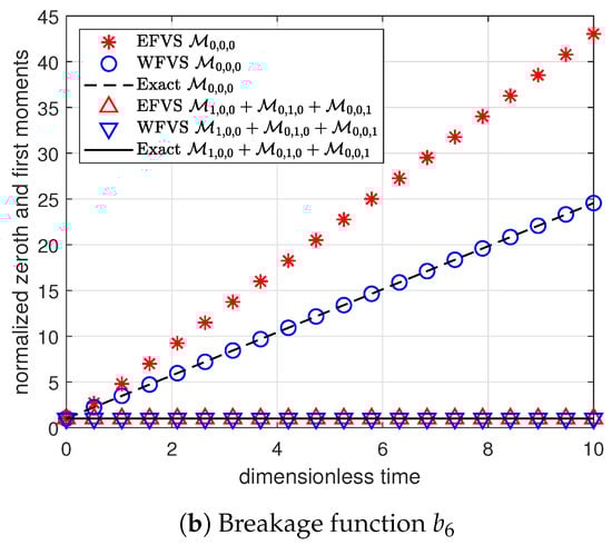 Figure 1 and Figure 2 represent the numerical moments obtained from EFVS and WFVS against their exact values with breakage functions and , respectively. More precisely, Figure 1a and Figure 2a present the comparison of zeroth and first-order moment functions, and Figure 1b and Figure 2b presents the first-order cross moment function . In order to obtain a clear visibility of different markers, we plot Figure 1a and Figure 2a on a semilogarithmic scale with respect to the y-axis. In both the cases, it is observed that WFVS estimates the zeroth-order, first-order and the cross moments with high accuracy, whereas the EFVS conserves the total volume but fails to produce a good estimate of the other moments.