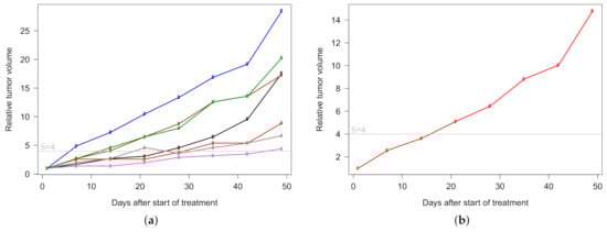 From these data, interpolation reveals that the average time required for each individual tumor to quadruple its initial volume is days, while the time required for the average of the relative volumes of tumors to reach a value of four is days. The disparity between the values is mainly due to the fact that the average relative volume of the tumors is a rather limited representation of the variability of the response to treatment.