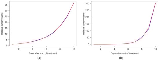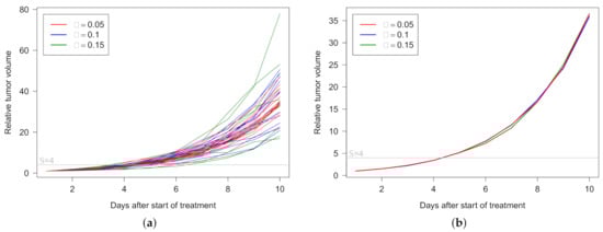 so (see Román et al. [27] for details). As a consequence, the time required to quadruple the average volume of the tumors is , regardless of the variability of . This means that if we consider simulated trajectories for different groups of individuals, generated with the same value of m and different values of , it is expected that the sample mean function in each group will be similar and will provide approximately the same time required to quadruple initial tumor volume. However, the average times required by the individual trajectories in each group to quadruple the initial volume will be affected by the different variability of the simulated processes and will yield quite different values.