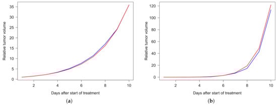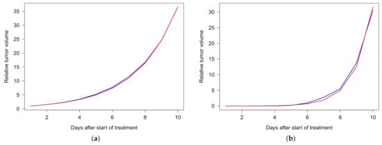 With the purpose of studying the delay in tumor growth induced by a therapy in a random environment, we consider again the data regarding the relative volume of tumor BC297MONp5 in mice that were studied by Albano et al. [13] and Román-Román et al. [15]. In these studies, the modeling of the relative volume of the tumor was carried out through the use of Gompertz diffusion processes. More specifically, a homogeneous version was considered for the control group, while for the group treated with cisplatin, it was necessary to modify the previous one by introducing two functions and in the infinitesimal moments. These functions represent the effect of therapy on growth rate and volume variability, respectively.