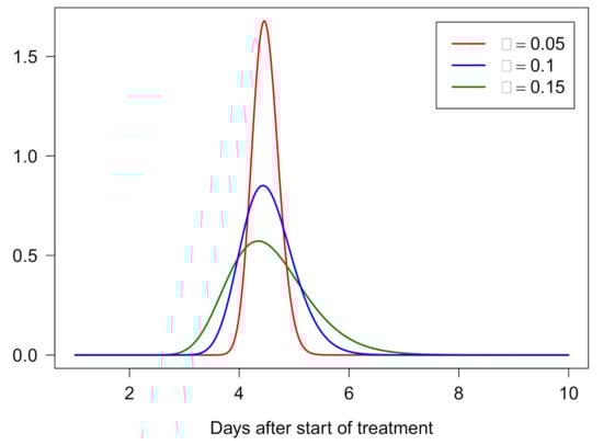 We focus our attention on the time required for the tumor to quadruple its initial volume, . Using the R package fptdApprox, the density functions of the f.p.t. of the Gompertz models estimated through were obtained (see Figure 7). From these densities, Table 3 was established, which summarizes the characteristics of the variable necessary to determine the proposed measures.